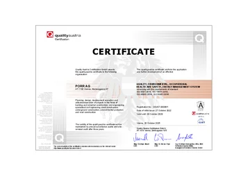We are aware of our responsibility towards people and the environment and, through efficient management processes, we do everything in our power not only to meet quality requirements, but also to think outside the box as an innovative company. In addition to our corporate policy, which encompasses energy policy, environmental policy and health and safety policy, we as the PORR Group are certified according to the following standards: