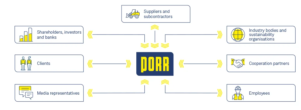 PORR's long-term economic success is based on aligning the company's activities with the needs of its stakeholders. An open, regular and target Group-oriented dialogue with all stakeholders promotes a shared understanding of interests, expectations and goals. This makes it possible to recognise impacts (inside-out), risks and opportunities (outside-in) at an early stage.