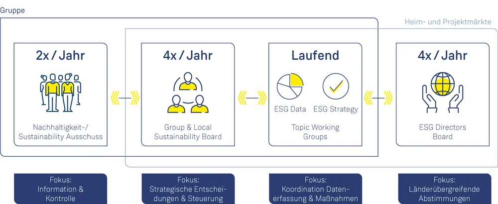 Das Group Sustainability Board, der abteilungsübergreifende Lenkungsausschuss, der quartalsweise tagt, setzt sich aus Gruppenleitern nachhaltigkeitsrelevanter Abteilungen, dem CFO und der CS Abteilung zusammen. Der Fokus liegt auf der Festlegung, Steuerung, Überwachung und Umsetzung der Nachhaltigkeitsstrategie und -maßnahmen.