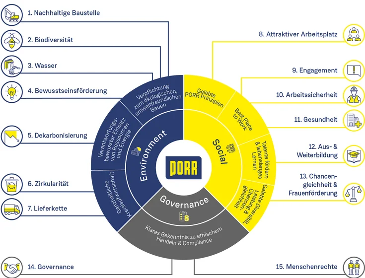 Die Nachhaltigkeitsstrategie der PORR Strategie beruht auf den drei Säulen Umwelt, Soziales und Governance und umfasst 8 Handlungsfelder mit insgesamt 15 Themen, die die strategischen Schwerpunkte konkretisieren. Auf Themenebene definiert die PORR 18 messbare Ziele bis 2030.
