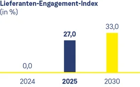 Der Lieferanten-Engagement-Index konnte von 0% in 2024 auf 27 % in 2025 erhöht werden. Bis 2030 soll mindestens ein Drittel der wichtigsten Lieferanten aktiv eingebunden sein. Damit gewinnt der Dialog entlang der Lieferkette spürbar an Bedeutung.