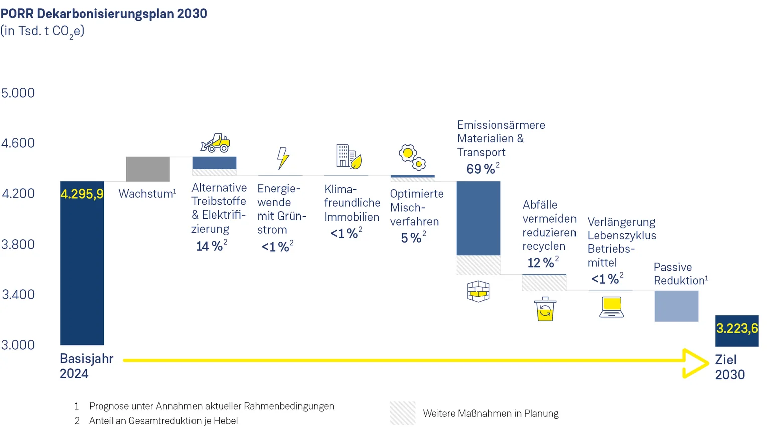 Der Dekarbonisierungsplan ist der strategische Fahrplan der PORR zur Reduktion ihrer Treibhausgasemissionen. Er umfasst die eigenen Geschäftsaktivitäten ebenso wie vor- und nachgelagerte Prozesse und berücksichtigt damit die wesentlichen Emissionstreiber entlang der gesamten Wertschöpfungskette.