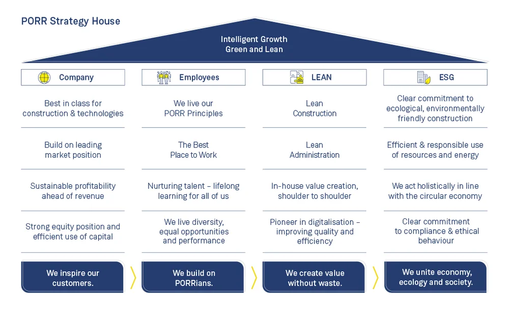 With selective, sustainable growth in PORR's seven home markets and a focus on circular construction, partnership-based project execution and lean processes, the overarching Group strategy remains unchanged: Intelligent growth with Green and Lean. It is guided by the vision “PORR – Home of Construction. To Build a Better World.” Its comprehensive portfolio of services covers the entire construction value chain and focuses on PORR’s core competence – building for a better world.
