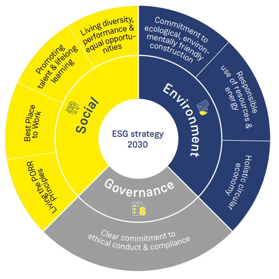 Eight central fields of action with clearly defined goals, measures and KPIs for 2030 form the strategic framework for driving forward PORR's sustainable transformation measurable and with clear targets by 2030. The strategy is based on the three pillars of Environmental, Social and Governance and takes into account company-specific opportunities, risks and the impact of CSRD as well as the expectations of key stakeholder groups.