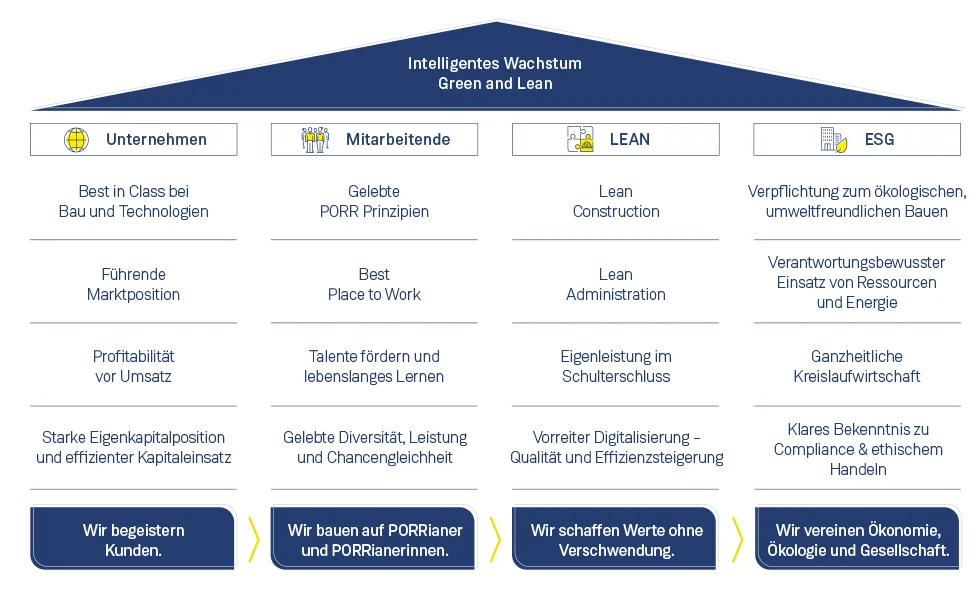 Mit selektivem, nachhaltigem Wachstum in den sieben HeimmĂ€rkten der PORR und dem Fokus auf kreislauffĂ€higem Bauen, partnerschaftlicher Projektabwicklung und schlanken Prozessen steht die ĂŒbergeordnete Konzernstrategie unverĂ€ndert fest: Intelligentes Wachstum mit Green and Lean. Sie orientiert sich an der Vision âPORR â Home of Construction. To Build a Better World.â Mit dem umfassenden Leistungsportfolio wird die gesamte Bau-Wertschöpfungskette abgedeckt und stellt die Kernkompetenz der PORR â das Bauen fĂŒr eine bessere Welt â in den Mittelpunkt.