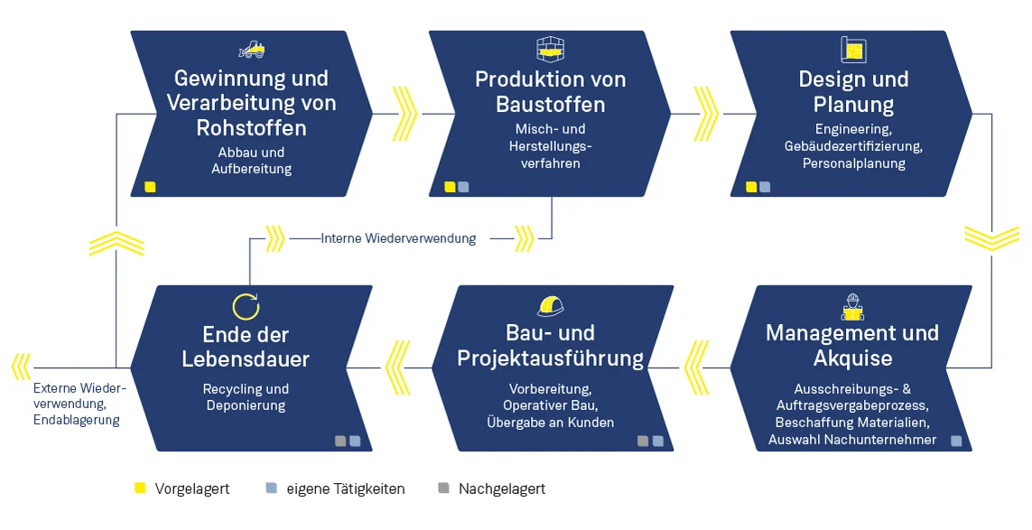 Aufgrund des breiten Leistungsspektrums der PORR kann sie alle wesentlichen Schritte der Bau-Wertschöpfungskette mit ihren eigenen Aktivitäten abdecken. Aufgrund der Individualität der Aufträge sind die Verantwortlichkeiten und Aufgabenbereiche zwischen der PORR und ihren externen Partnerinnen und Partnern unterschiedlich geregelt. Dadurch können Aspekte der Wertschöpfungskette sowohl vor- als auch nachgelagert sein. Damit ist die PORR von ihren Auftraggeberinnen und Auftraggeber bzw. Kundinnen und Kunden und deren Aktivitäten abhängig. Der übergeordnete Fokus liegt auf kreislauffähigem Bauen und darauf, möglichst viele Ressourcen nachhaltig im Baukreislauf zu halten.
