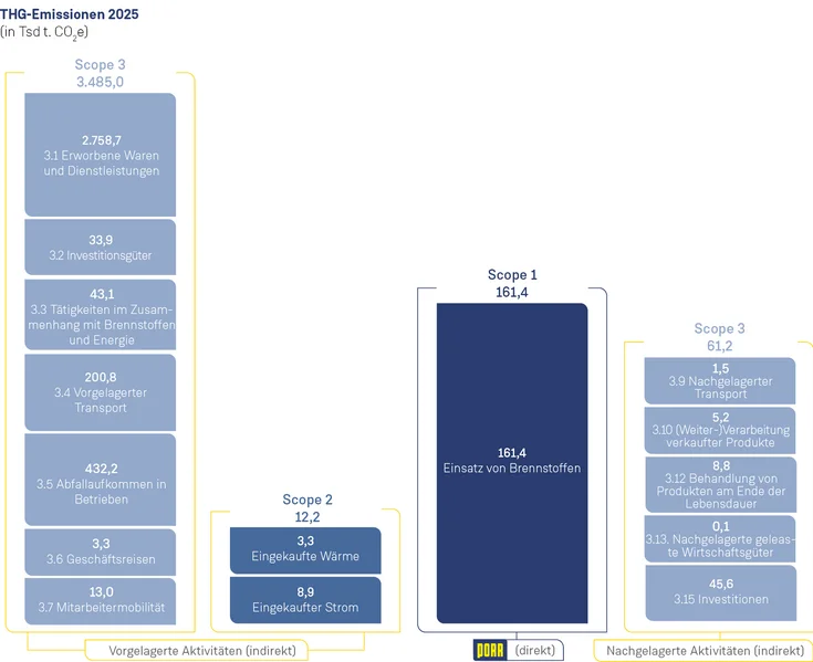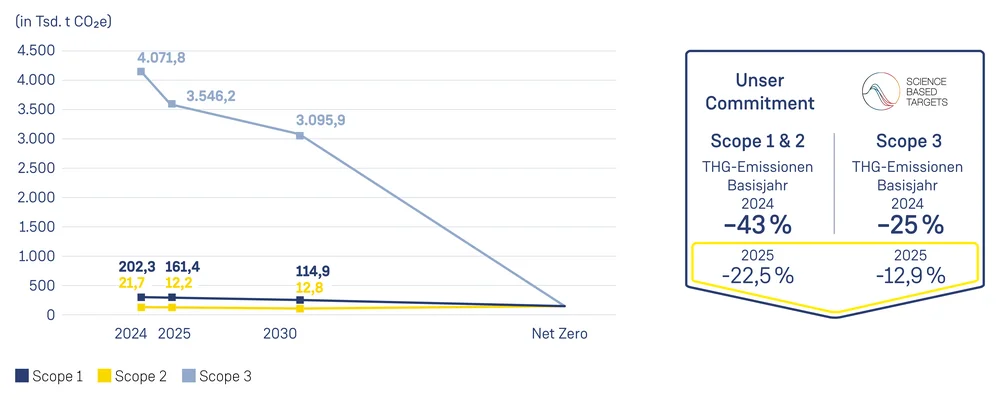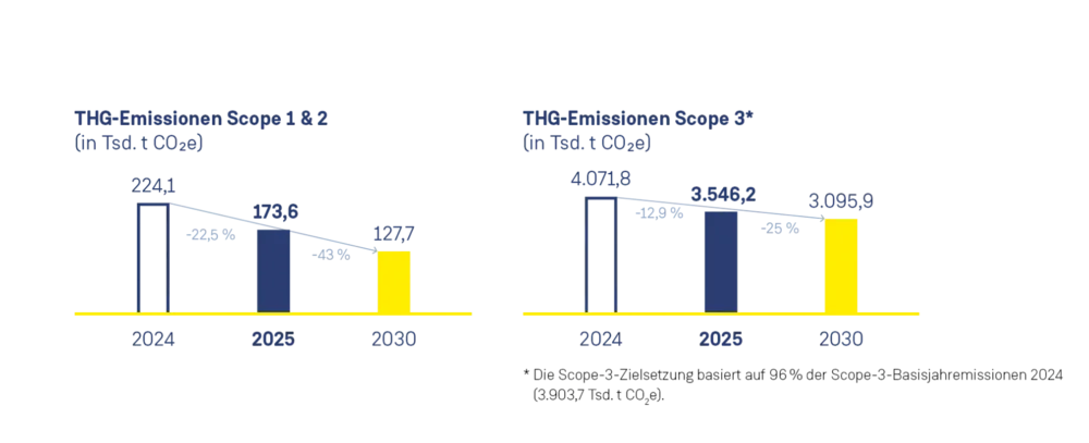 - Scope 3: Reduktion um 25 %: Im Vergleich zum Basisjahr 2024 (4.071,8 Tsd. t CO2e) konnten die Emissionen 2025 bereits um 12,9 % auf 3.546,2 Tsd. t CO2e gesenkt werden.