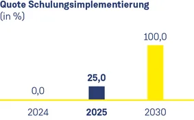 Die Fortschritte werden über die Quote der Schulungsimplementierung gemessen. Sie basiert auf vier zentralen Themenbereichen. Im Basisjahr 2024 lag die Quote bei 0 %, bis 2030 sollen alle umgesetzt sein.